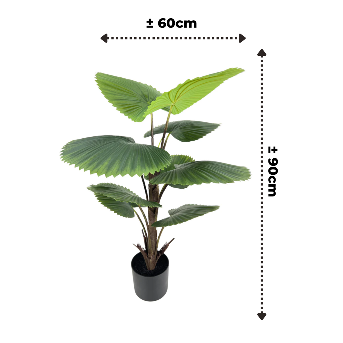Voordelen van een kunst waaierpalm ✅ Onze kunstplanten gaan nooit dood✅ Onze kunstplanten zijn hypoallergeen✅ Onze kunstplanten vorm je eenvoudig naar wens✅ Onze kunstplanten blijven altijd de gewenste afmeting✅ Onze kunstplanten hebben geen verzorging nodig en kunnen overal staan Afmetingen kunst waaierpalm 90cm Hoogte kunstplant: 90cmDiameter kunstplant: 60cmHoogte pot: 12cmDiameter pot: 13cm