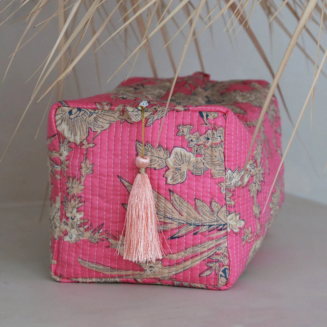 In this colorful blockprint cotton toiletry bag you can take all your toiletries and makeup everywhere. This toiletry bag with zip closure is made of organic cotton has a coated inner lining with 4 inner compartments.