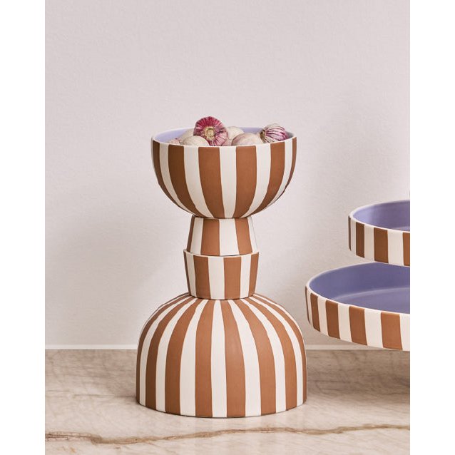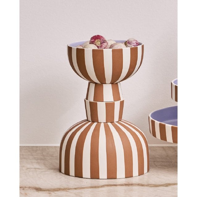 De Toppu-kom heeft een handgeschilderd gestreepte ontwerp met een scheutje kleuren. Perfect voor het serveren van snacks, fruit of kleine gerechten, het voegt een gewaagde, moderne aanraking toe aan elke tafel. De handgeschilderde afwerking zorgt ervoor dat elke kom uniek is en de sculpturale vorm maakt het een opvallend stuk in elke kamer.