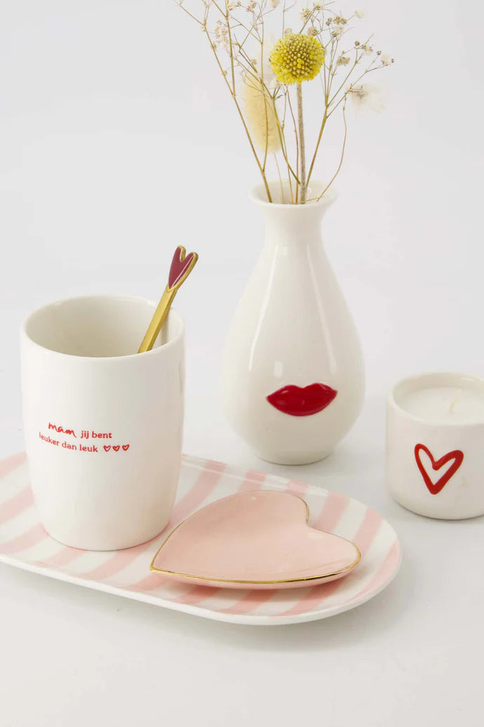 Deze leuke Zusss vaas maakt jouw woonkamer helemaal af! Dit keramieken vaasje is wit van kleur en heeft een ronde vorm. Op de voorkant staan rode lippen. De vaas heeft een doorsnede van 7cm en is 13cm hoog.