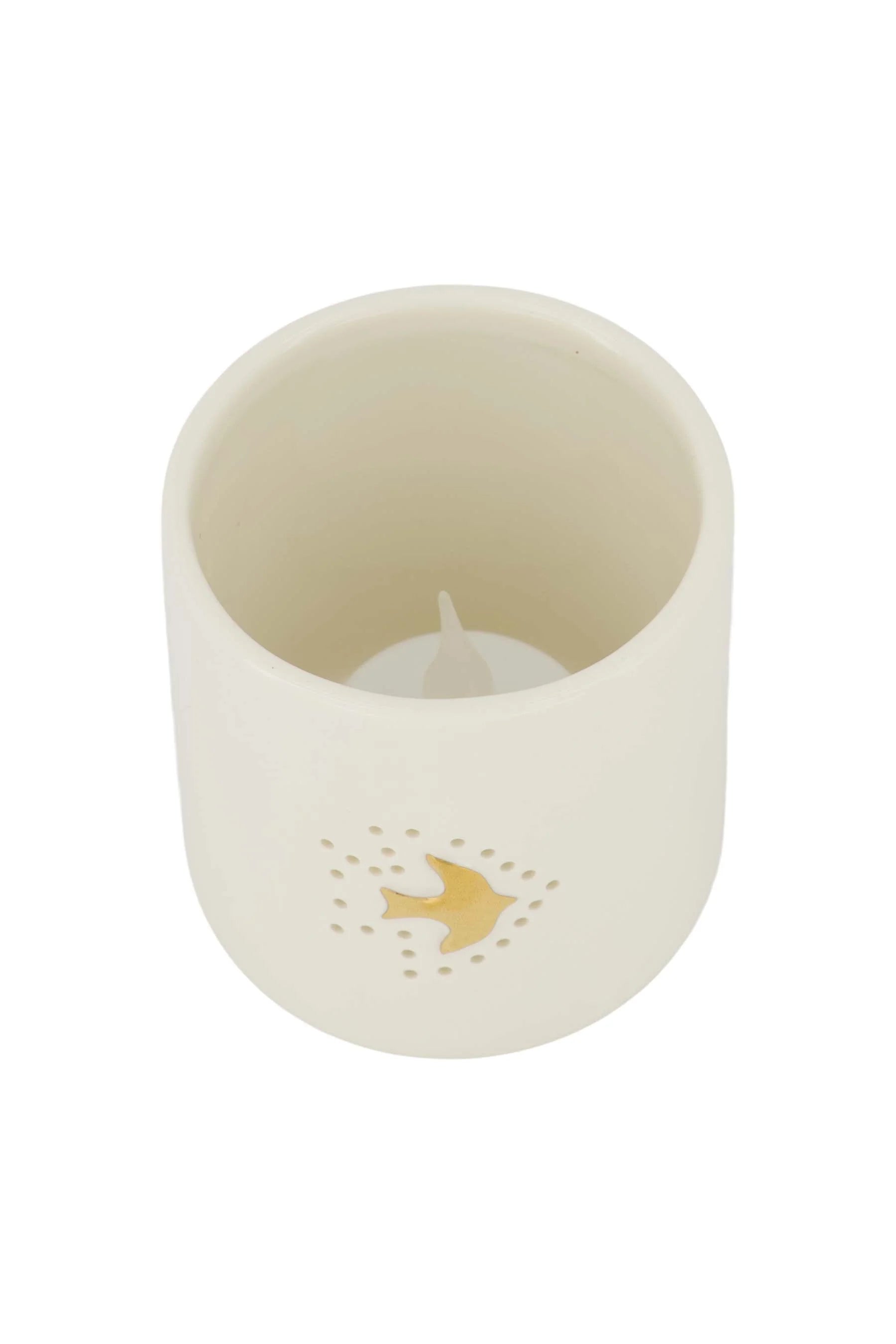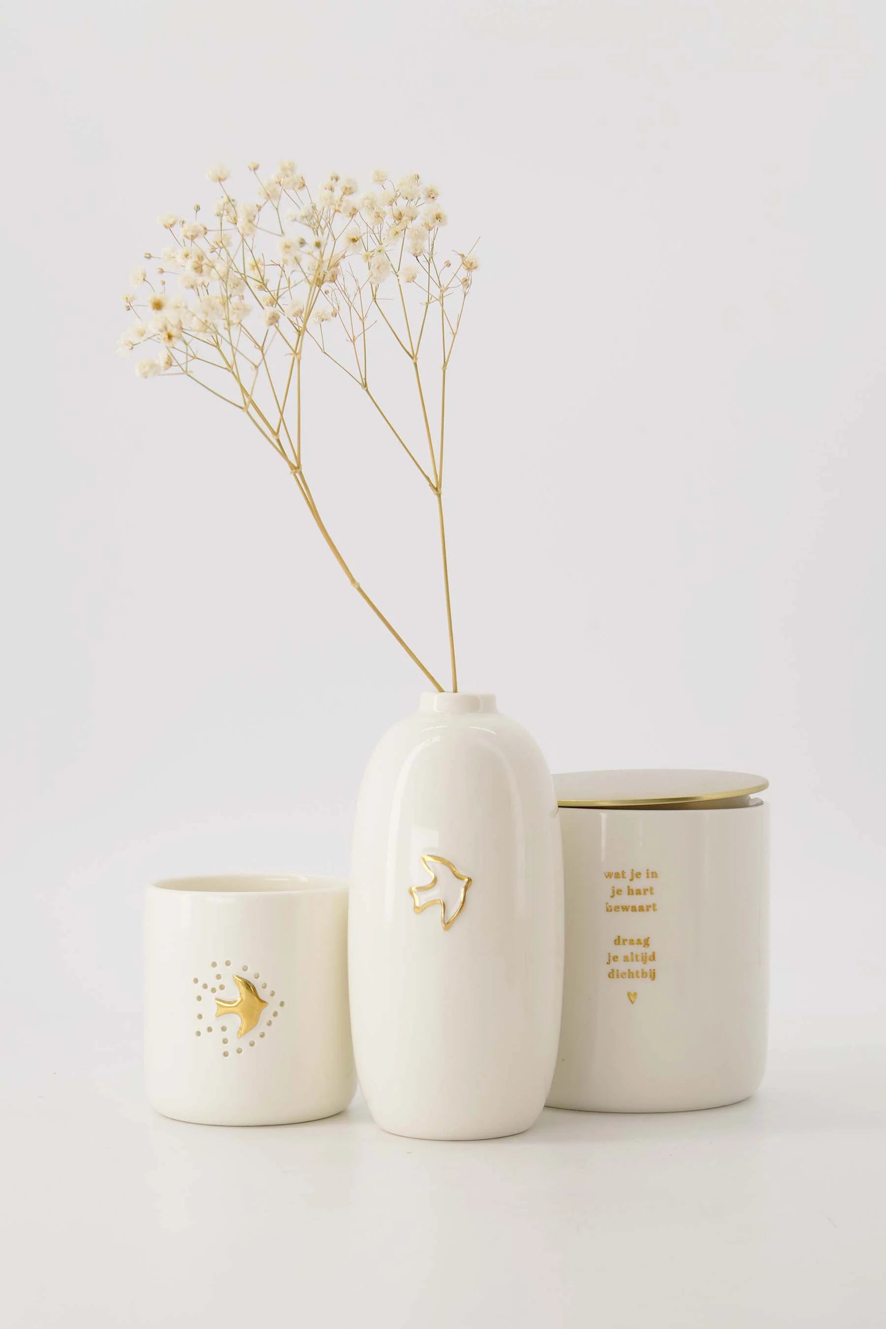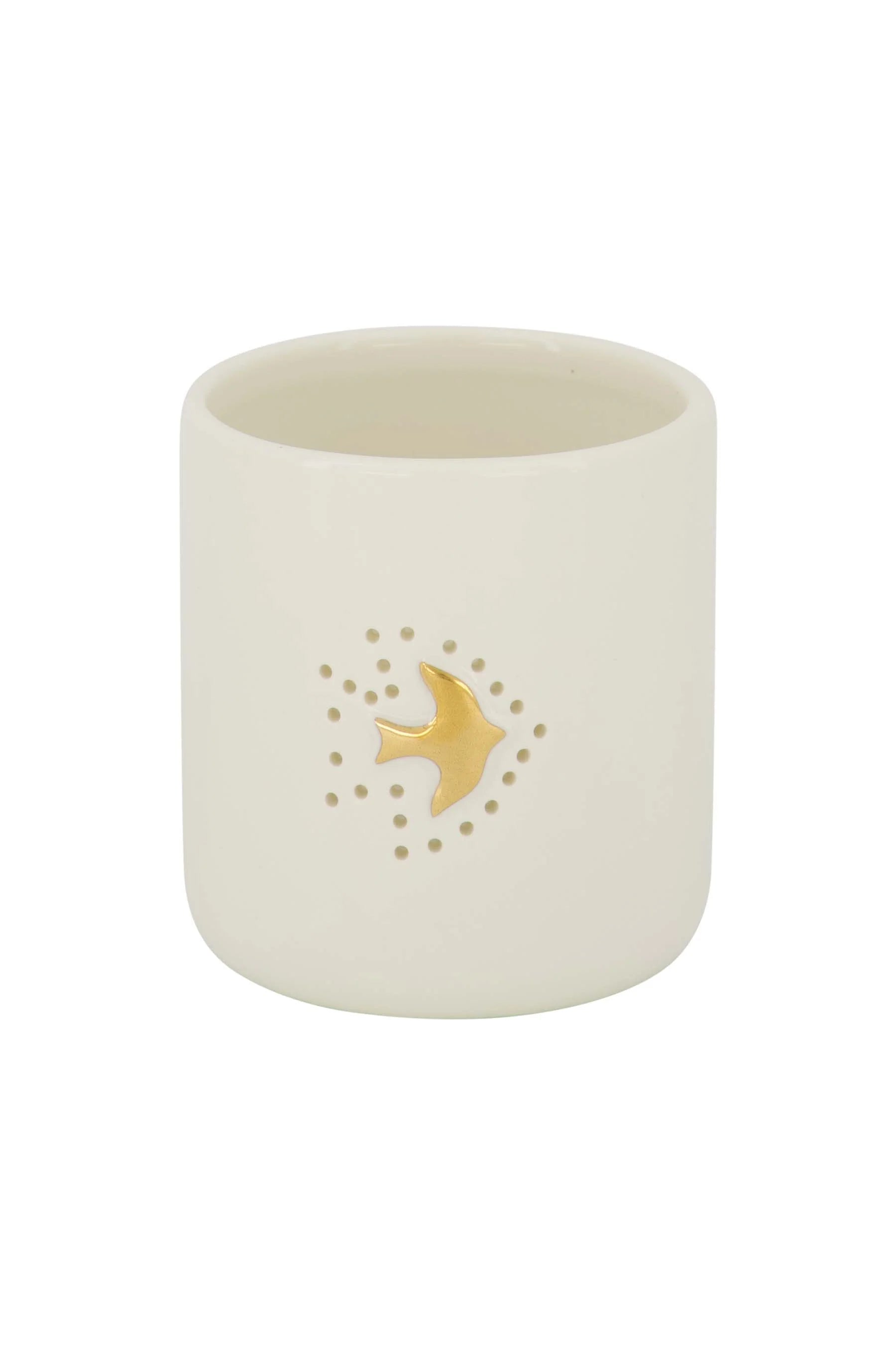 De Zusss waxinelichthouder keramiek brengt een warme en gezellige sfeer in je woonkamer. Deze stijlvolle waxinelichthouder is van wit keramiek met een subtiel goudkleurig vogeltje erop, wat zorgt voor een uniek en lief detail. Dankzij het eenvoudige, maar speelse ontwerp past hij perfect bij verschillende woonstijlen. Zet er een kaarsje in en geniet van het zachte licht dat door de kleine gaatjes rondom het vogeltje schijnt. Een mooi accessoire dat jouw interieur nét dat beetje extra geeft.
