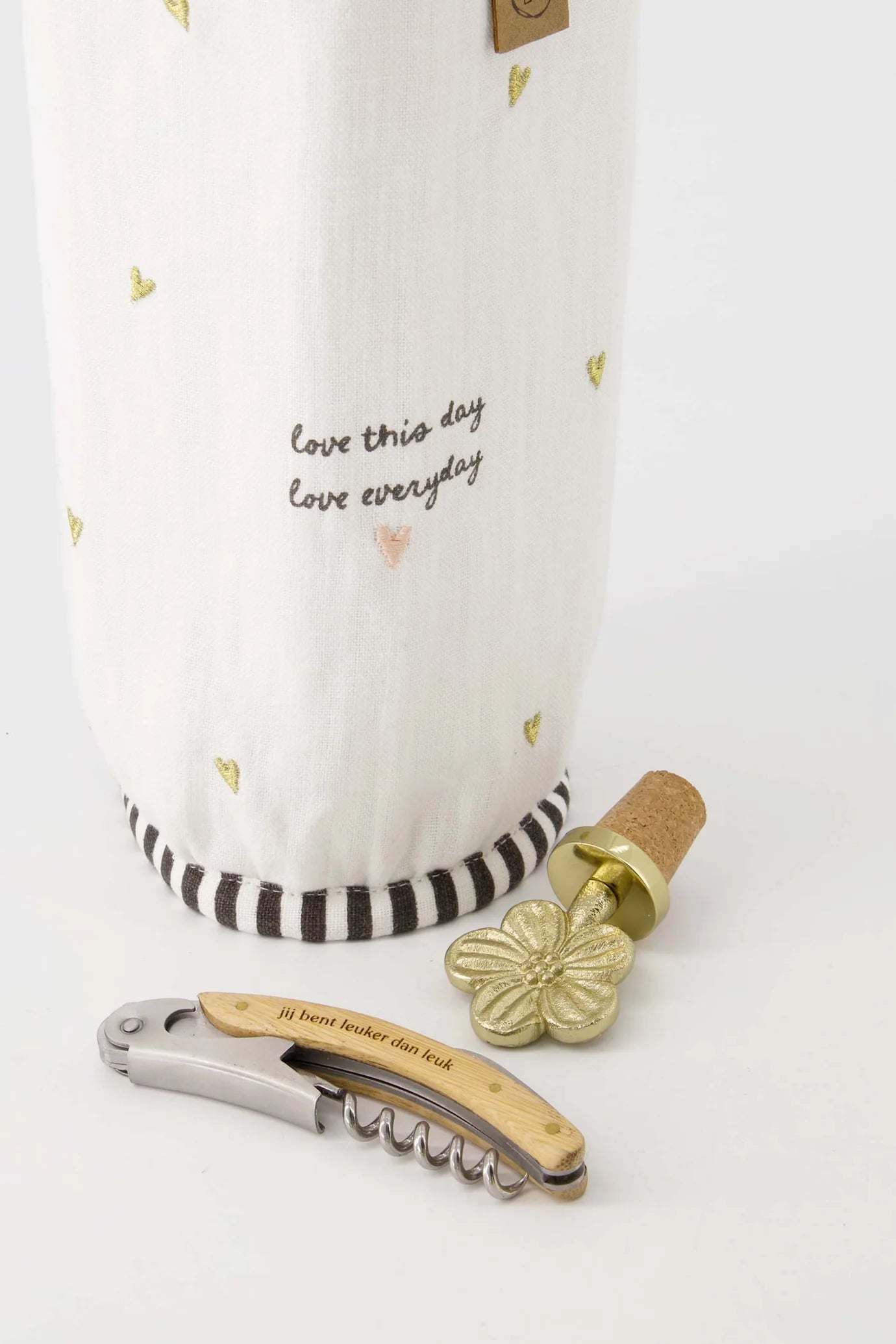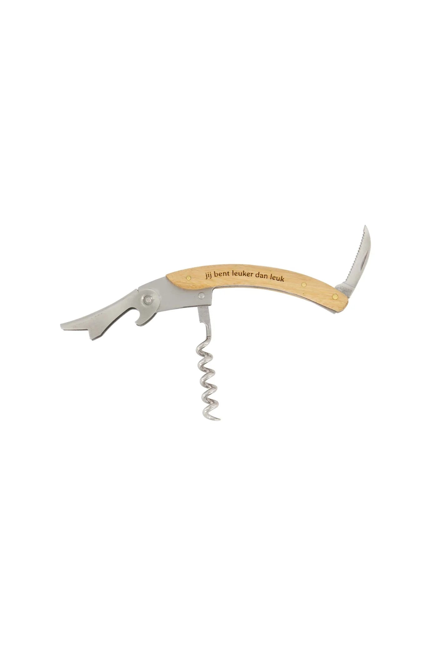 Deze wijnopener van Zusss is zo leuk! Dit stoere item is gemaakt van metaal met een houten handvat. Daarop staat de tekst 'jij bent leuker dan leuk'. De wijnopener heeft een formaat van 14x7cm. Ook erg leuk als cadeau !